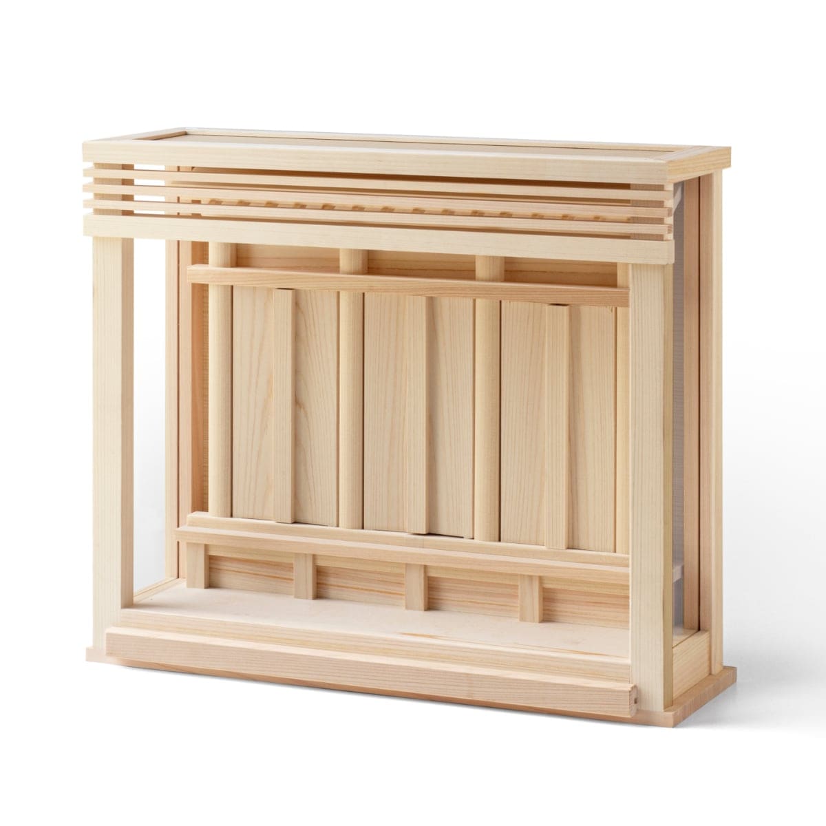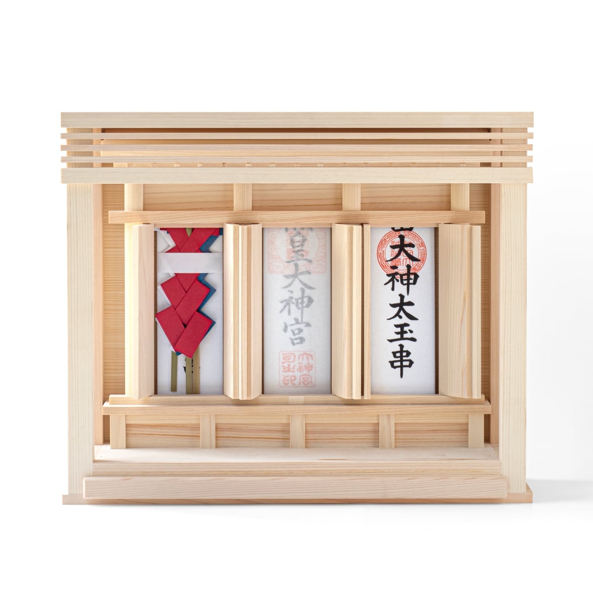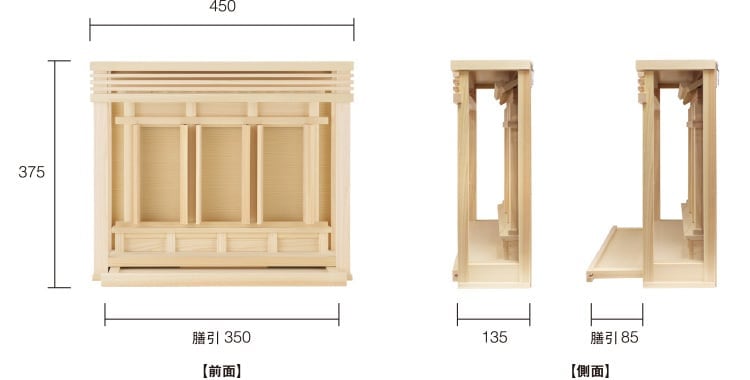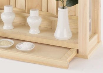 箱宮背面に壁取付金具が付いており、神棚本体に神具を乗せることのできる膳引出付き。